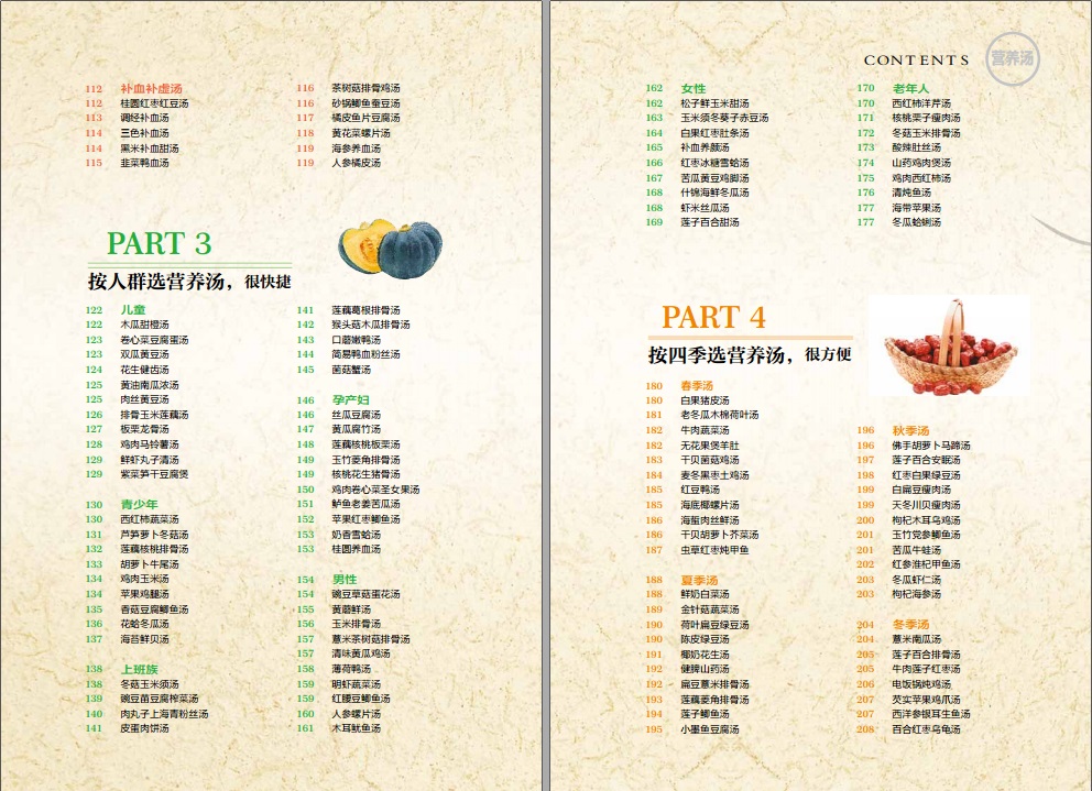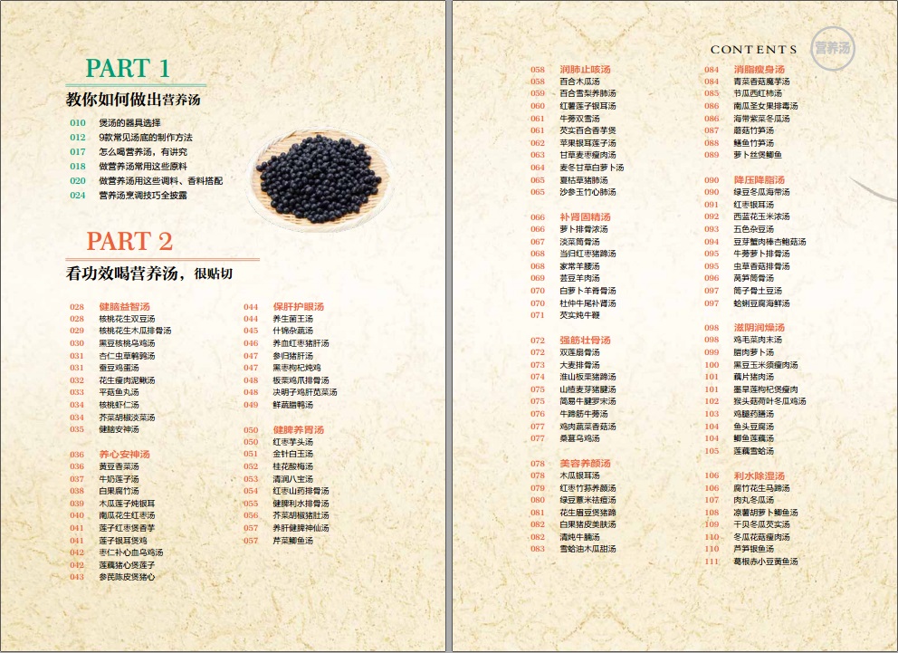 本书共分为四章:第一章主要介绍煲汤的基本知识;第二章根据功效介绍相应的营养汤;第三章则根据不同人群的需求,分别介绍适合每种人群特点的营养汤;第四章根据四季的特点,介绍适合在不同季节饮用的营养汤。本书还利用二维码将营养汤的制作与视频紧密结合,可以让读者清晰看到一些营养汤的制作方法