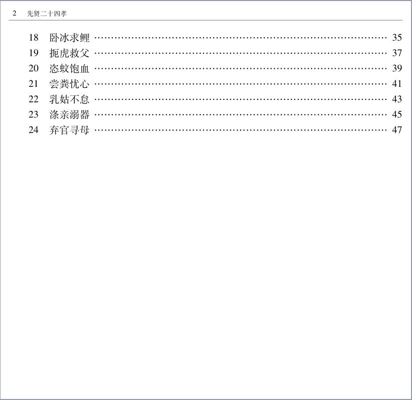 孝是中国古代重要的伦理思想之一。《全相二十四孝诗选》简称《二十四孝》,是元代郭居敬辑录古代24个孝子的故事编辑而成,其故事大都取材于西汉经学家刘向编辑的《孝子传》,也有一些故事取材《艺文类聚》、《太平御览》等书籍,是历代先贤二十四孝的故事,脍炙人口,流传千古,故事宣扬“以孝为先”的思想,至今仍事人们所遵循的基本道德规范。不但激励人们努力弘扬美德,传承文明,而且能在构建和谐社会中发挥巨大的作用。