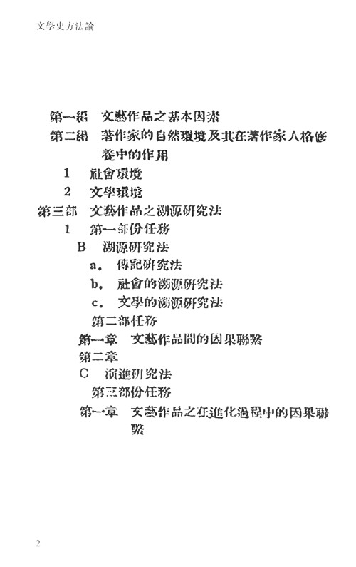 《中国国家图书馆藏·民国西学要籍汉译文献·文学艺术:文学史方法论》分151个篇目,论述文学史的对象、任务及方法,文艺作品的溯源研究法和进化过程的因果联系等问题。