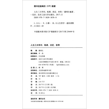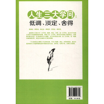 《人生三大学问:低调、淡定、舍得》探讨了人生的三大学问,告诉大家:一个人如果真正懂得了生活的真谛,学会了低调、淡定、舍得的智慧,就会在追求成功与幸福梦想的过程中保持良好心态,有所为、有所不为,实现人生价值。
