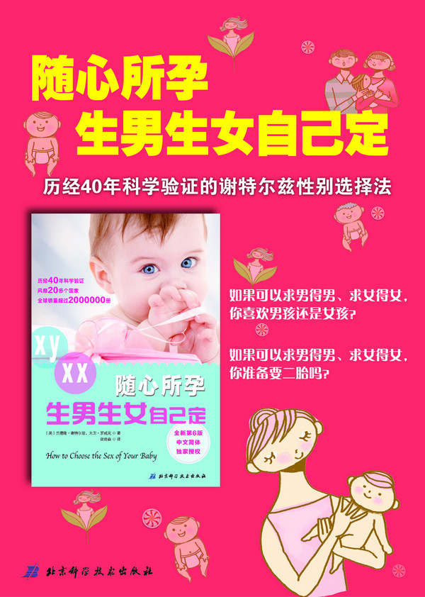 40多年来,谢特尔兹法凭借自身良好的口碑长盛不衰,并在20多个国家取得良好效果,帮助数百万来自世界各地的准父母实现了自由选择宝宝性别的家庭梦想。尽管如此,《随心所孕(生男生女自己定)》并不是一本简单的“推销产品”。书中客观全面地向读者展现了性别选择领域以前和现在的种种研究成果,帮助读者理解谢特尔兹性别选择法的发展过程和科学证据。同时也介绍了近年来出现的其他性别选择法,并解释为什么我们认为这些方法有效或者无效。