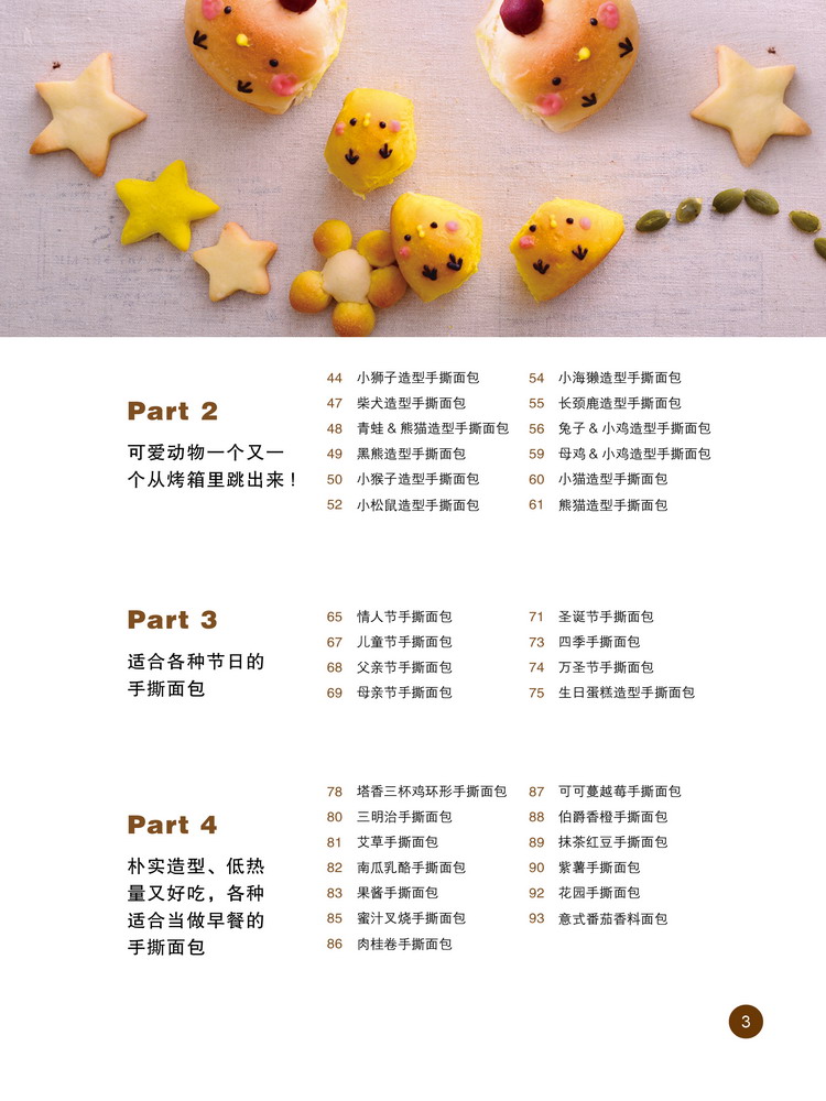 本书从面包发酵,上色方法,成形,到基础手撕面包做法,一步一步教你做。面包造型多变,除了动物、卡通造型手撕面包,还有搭配节日的面包以及造型朴实但口味丰富的手撕面包,满足多种需求。制作过程巧妙避开色素,使用自然色粉、或食材的果汁果泥制作面团,使用南瓜泥做成小蜜蜂的黃色、竹炭粉调出黑熊身上的黑色等,好吃好看又健康!松软的手撕面包,想吃多少撕多少,是早餐、露营、聚会、派对都可以一起分享欢乐又美味的点心。