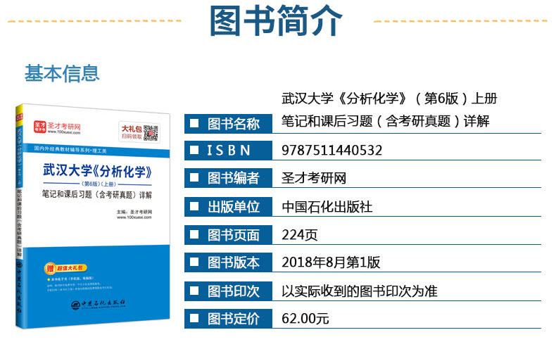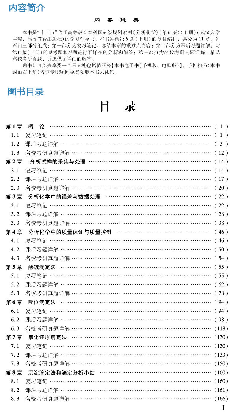 本书是“十二五”普通高等教育本科国家级规划教材《分析化学》(第6版)(上册)(武汉大学主编,高等教育出版社)的学习辅导书。本书遵循第6版(上册)的章目编排,共分为11章,每章由三部分组成:第一部分为复习笔记,总结本章的重难点内容;第二部分为课后习题详解,对第6版(上册)的思考题和习题进行了详细的分析和解答;第三部分为名校考研真题详解,精选名校考研真题,并提供了详细的解答。
