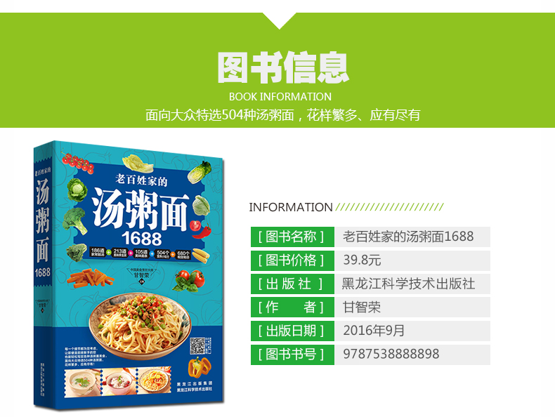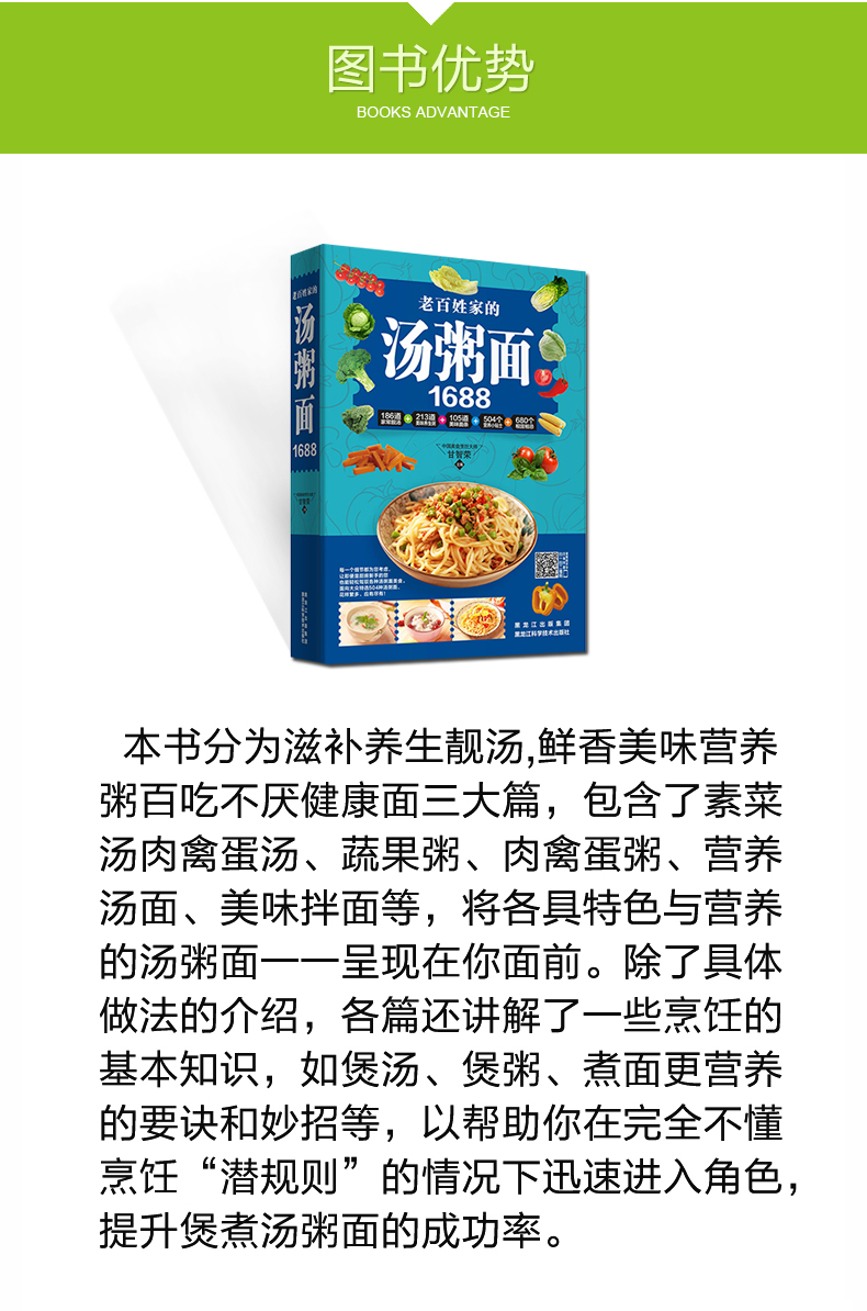 《老百姓家的汤粥面1688》第一章介绍了各种经典素汤、荤汤、海鲜汤的做法,选材多为生活中*常见易得、且价格亲民的食材,无论是蔬菜、畜肉、禽蛋还是水产,经过一双巧手和厨具的碰撞,都会成为家人餐桌上*出彩的宠儿。《老百姓家的汤粥面1688》的第二章就为您介绍各式各样的粥,除了满足口腹之欲,兼得养生、食疗的功效,用一锅好粥轻松滋补全家人。第三章介绍关于煮面、炒面的常识。各式各样的面条,搭配丰富多样的食材与调料,呈现出多道或鲜香精致、或清淡美味的面。