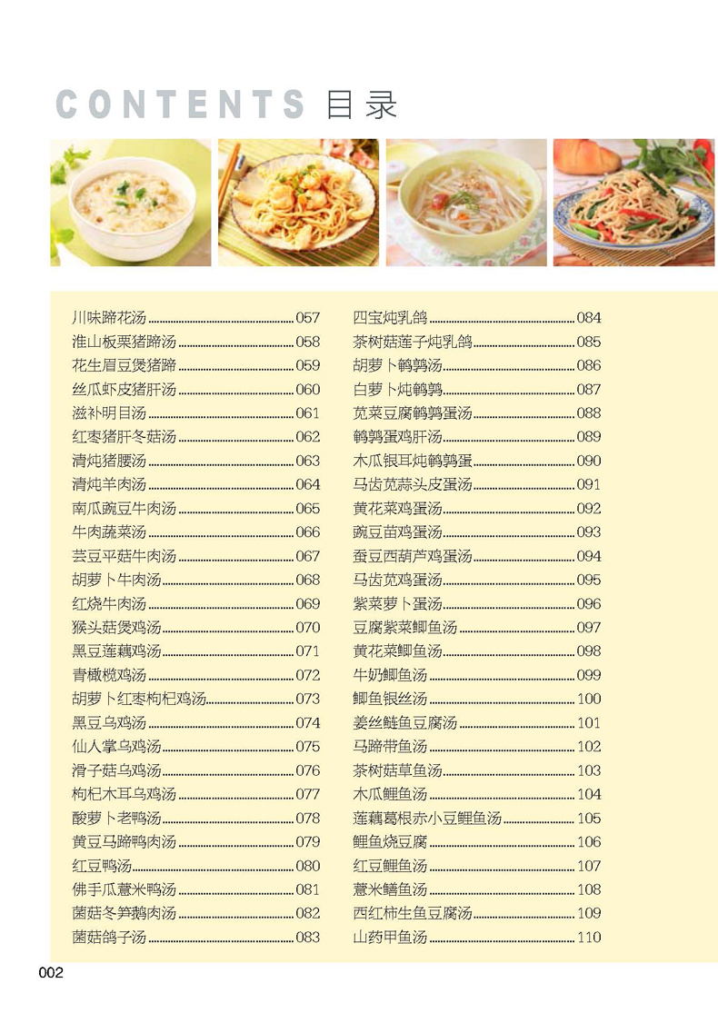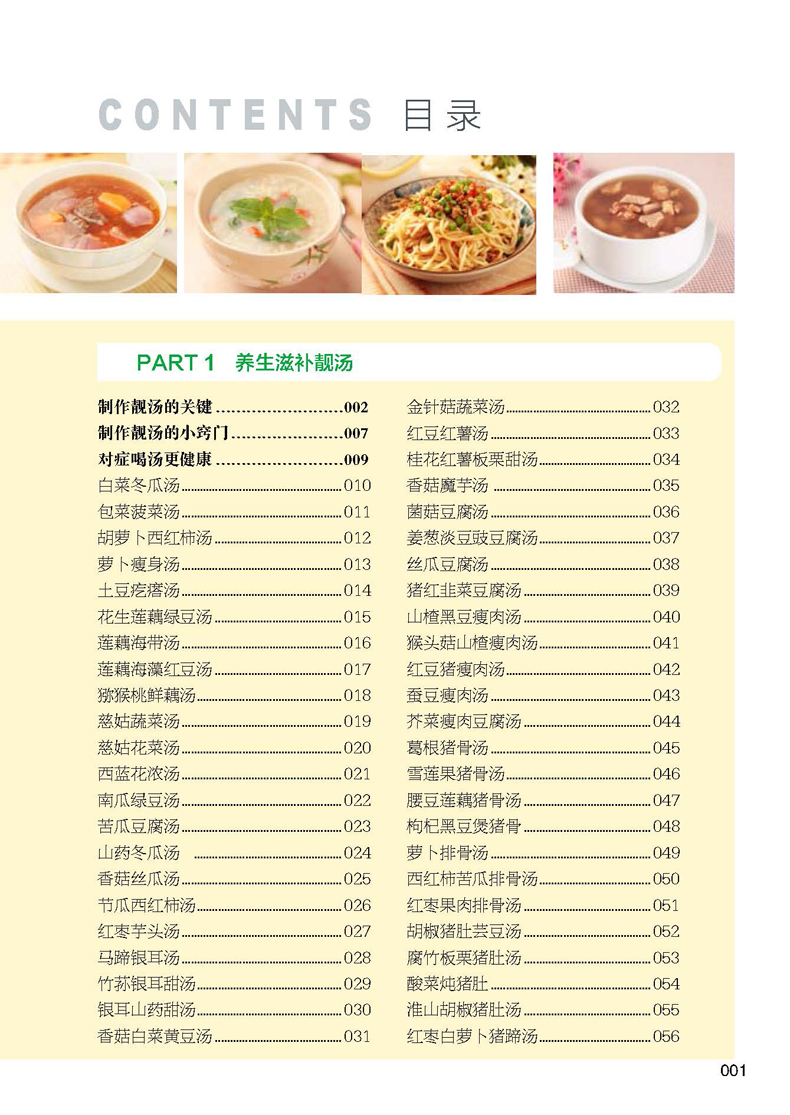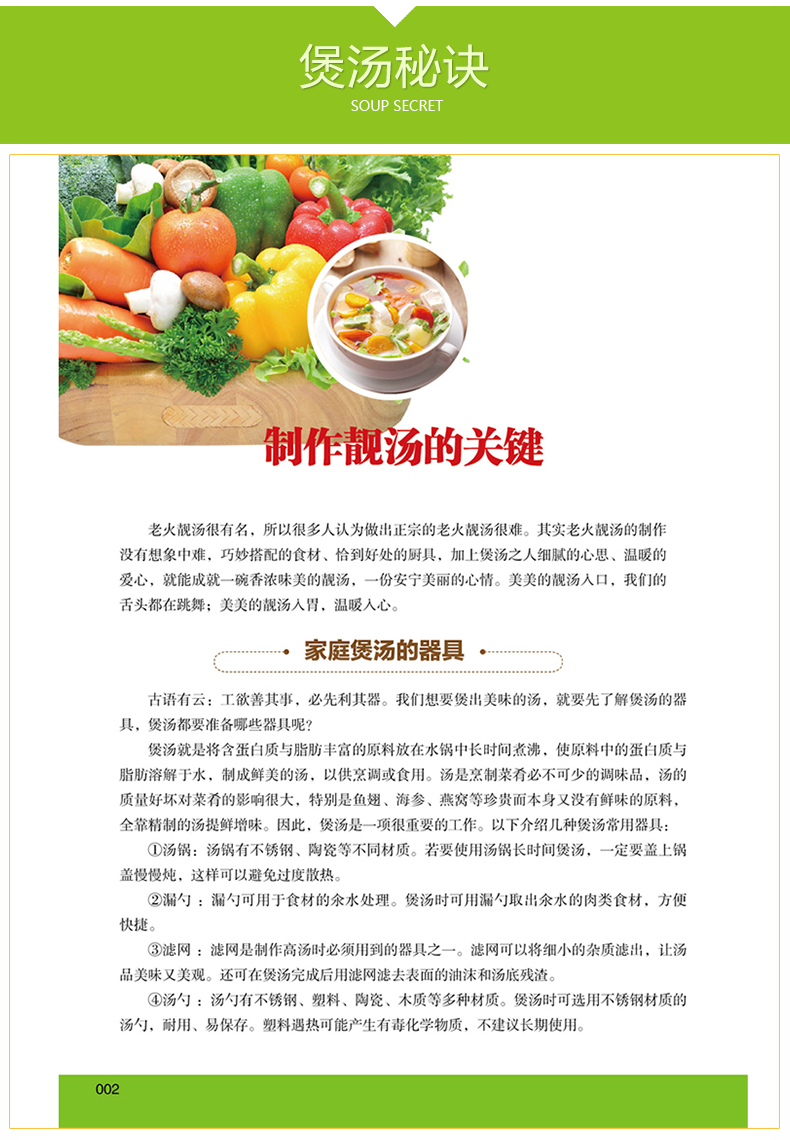 本书为您精选的500多道营养又美味的汤、粥、面,每道菜均配有精美成品图和详细的做法、步骤图,还附有一个二维码,能跟着视频学做菜肴,做法一目了然。从食材的选择,到详尽的步骤指导和贴心的烹饪技巧提示,针对所用食材,提出相宜相克及营养、烹饪小贴士,每一个细节都为您考虑,让即便是厨房新手的你也能轻松驾驭各种汤、粥、面美食,让全家人都能吃得开心、吃得健康,让生活再滋润一点。