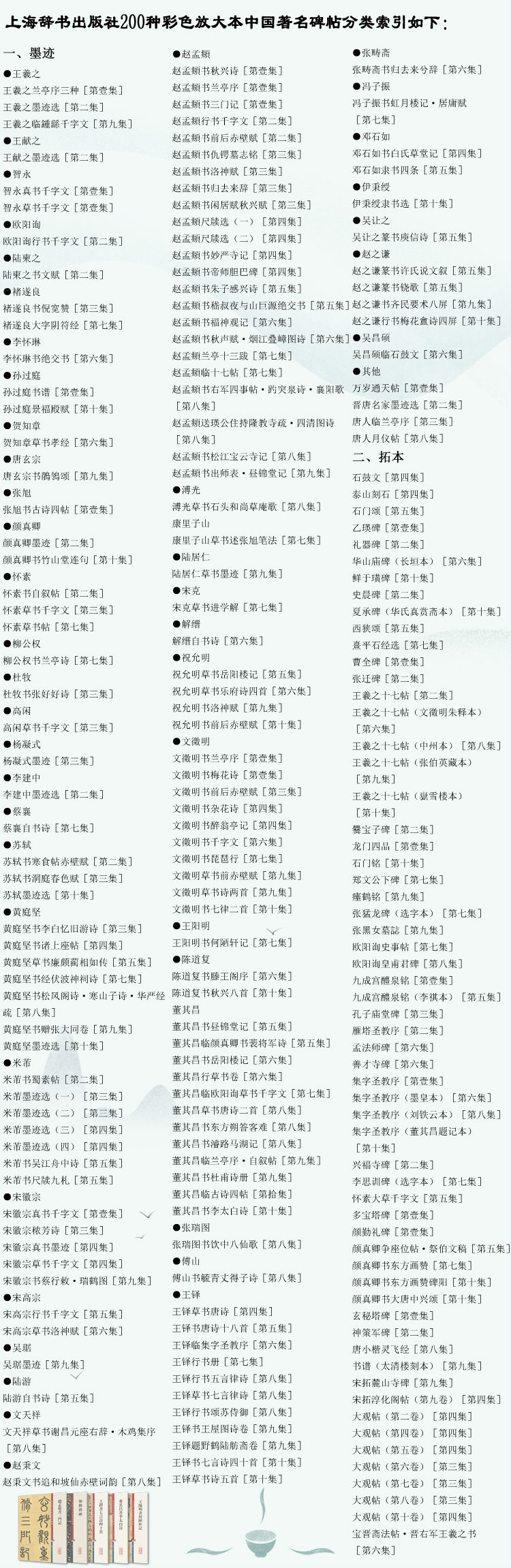 所涉历代书家有王羲之、王献之、智永、欧阳询、陆柬之、褚遂良、李怀琳、孙过庭、贺知章、唐玄宗、张旭、颜真卿、怀素、柳公权、杜牧、高闲、杨凝式、李建中、蔡襄、黄庭坚、米芾、宋徽宗、宋高宗、吴琚、陆游、文天祥、赵秉文、张畴斋、冯子振、赵孟頫、溥光、康里子山、陆居仁、宋克、解缙、祝允明、文徵明、王阳明、陈道复、董其昌、张瑞图、傅山、王铎、邓石如、伊秉绶、吴让之、赵之谦、吴昌硕等;名碑如石鼓文、石门颂、乙瑛碑、礼器碑、华山庙碑、鲜于璜碑、史晨碑、夏承碑、西狭颂、熹平石经、曹全碑、张迁碑、爨宝子碑、龙门四品、石门铭、郑文公下碑、瘗鹤铭、张猛龙碑、张黑女墓志、孔子庙堂碑、孟法师碑、善才寺碑、兴福寺碑、李思训碑、多宝塔碑、颜勤礼碑、玄秘塔碑、神策军碑等。名碑名帖齐聚,蔚为大观,堪称"纸上书法博物馆"。