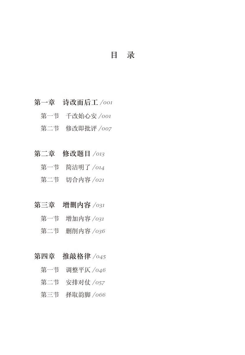 本书系统地论述了诗词修改诸多方面的问题,从诗词修改的重要性,谈到诗词创作与修改的内在联系,总结了斟酌诗题、炼字达意、完善格律等方面的经验和方法,内容深入浅出,例证丰富,可读性强。