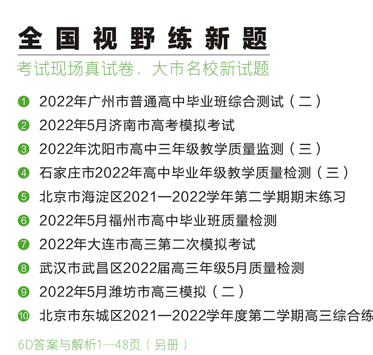 本书所选试卷多为2022高考前一个月内大型模拟统考试卷,因为考试较晚,目前市面上已有的2023年高考模拟汇编类产品未曾来得及收录,具有独特性;试卷本身都是大型考前模拟卷,命制规范、价值高,是很好的练手材料。
