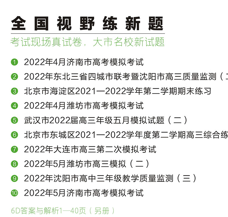 本书所选试卷多为2022高考前一个月内大型模拟统考试卷,因为考试较晚,目前市面上已有的2023年高考模拟汇编类产品未曾来得及收录,具有独特性;试卷本身都是大型考前模拟卷,命制规范、价值高,是很好的练手材料。