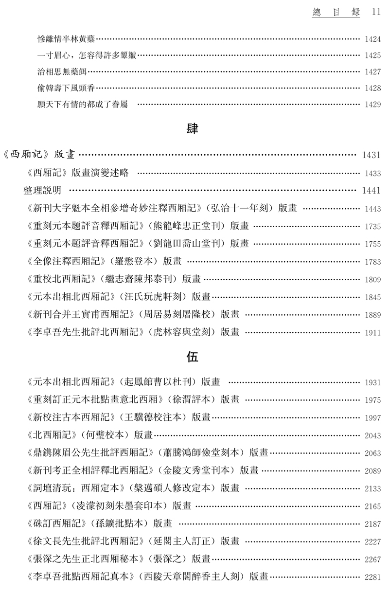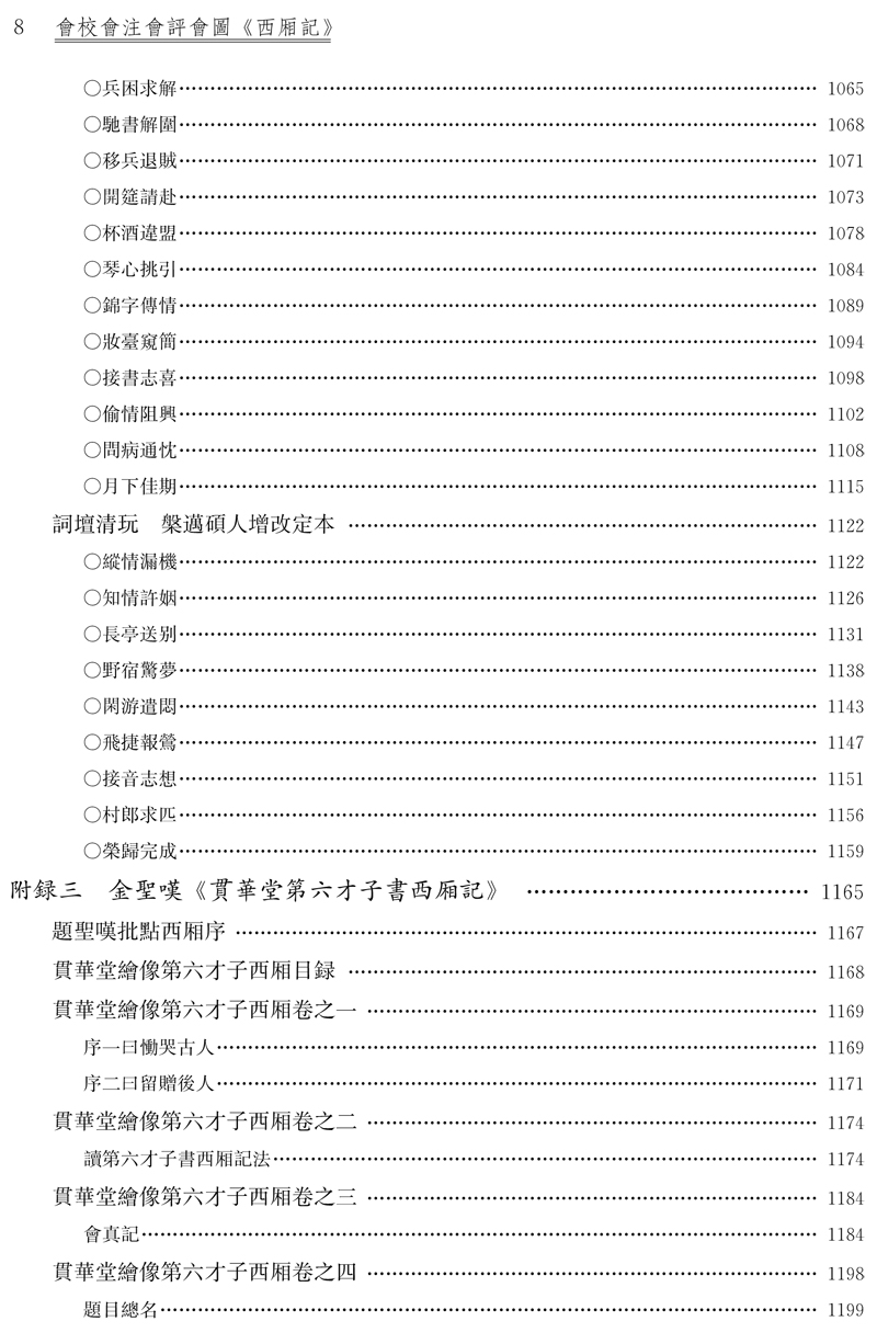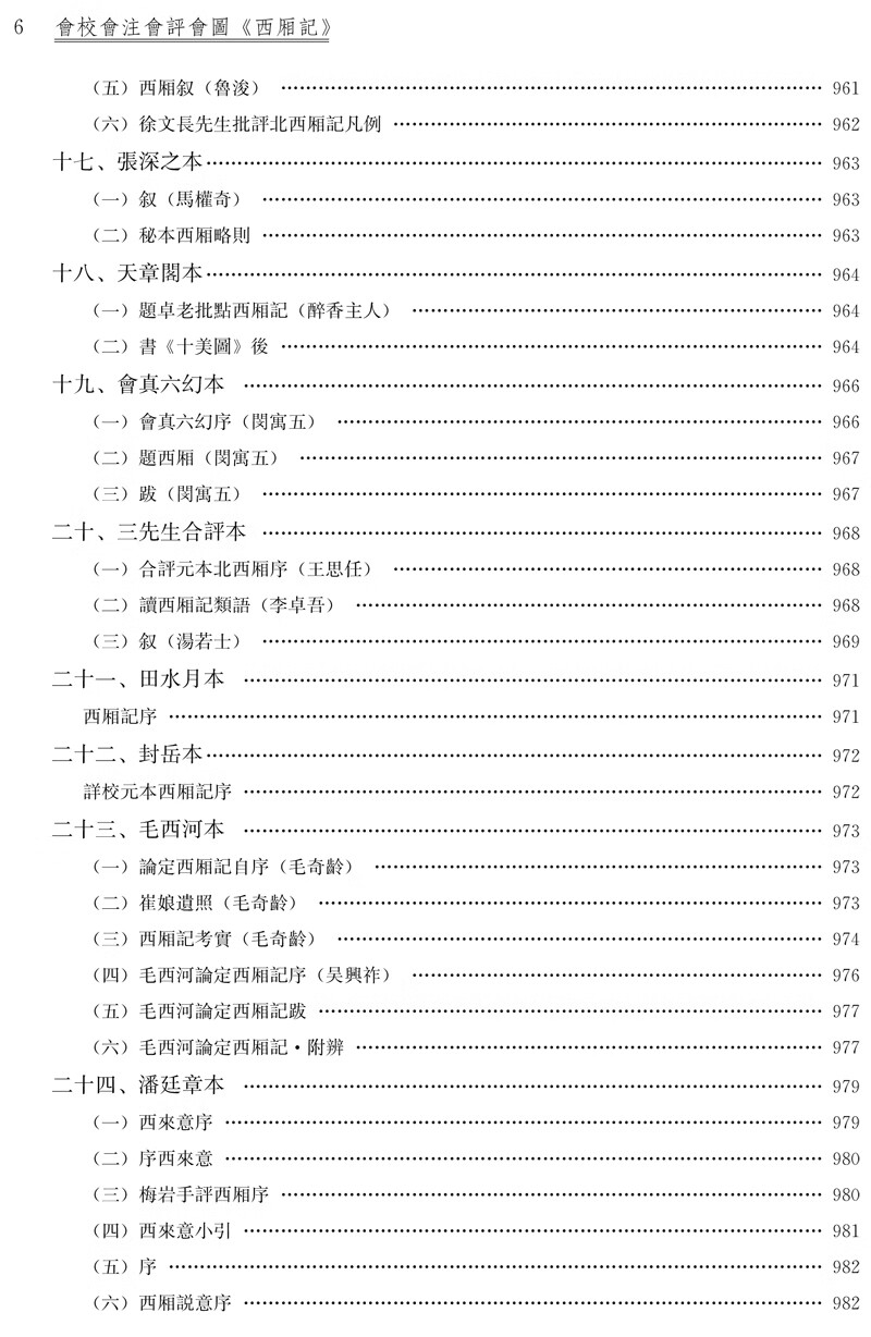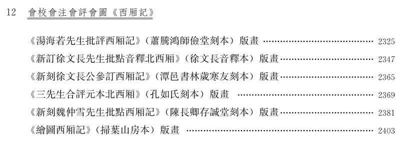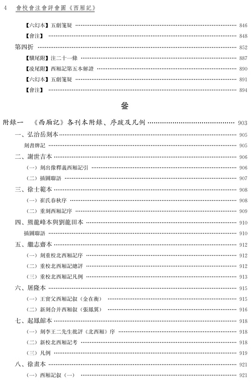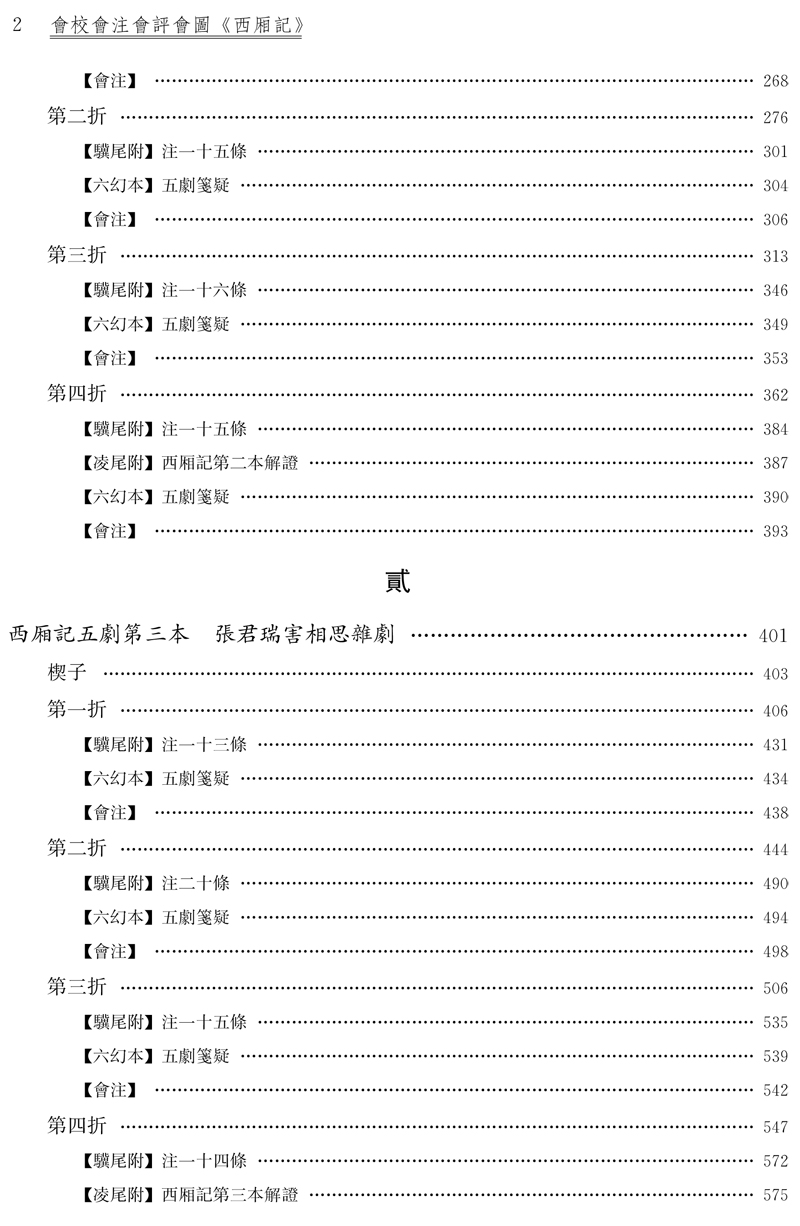 (一)《西厢记》基本情况王实甫的《西厢记》是我国古典戏剧杰作,与汤显祖《牡丹亭》、孔尚任的《桃花扇》、洪升的《长生殿》称为称中国四大古典戏剧。是中国古典戏剧里演出历史**、也最多的作品,至今不衰。古代的演唱,已有多种研究专著问世;当代演出中,京剧、昆曲、越剧、豫剧等舞台上,《西厢记》仍是深受观众喜爱的剧目。 它叙述了书生张君瑞和相国小姐崔莺莺邂逅相遇、一见钟情,经红娘的帮助,为争取婚姻自主,敢于冲破封建礼教的禁锢而私下结合的爱情故事。作者王实甫用他的艺术之犁耕耘着人们的心田,他播下诗一样美的爱情的种子,也是没有族群之分的普世大爱,产生着千古不衰的艺术魅力,给人艺术的美感享受。由于美则受人喜爱,《西厢记》的影响也已经越出了国界,成为世界人民的共同财富,日本、朝鲜、英、法、美、俄等均有译本。深受世界人民的赞赏,润泽人心,惠及中外。在当下弘扬中国传统文化,向世界讲好中国故事的大背景下,系统整理这些不同时代的《西厢记》,了解其不同时代、不同地域的传播脉络和时代特色,对于当下讲好中国故事,增强中华文化自信具有极强的借鉴意义。 (二)本书整理出版的特点 1.整理者 系中国古典文学、戏曲文化研究专家学者 本书由中国戏曲研究、《西厢记》研究的专家学者张燕瑾、汪龙麟教授主持,长期从事中国传统文化研究,特别是《西厢记》等戏曲文化研究,对《西厢记》传世版本状况及其源流系统熟稔,为本书奠定了专业学术基础。 中国古代文学研究专家张燕瑾教授,首都师范大学中文系教授、古籍整理研究所所长。张燕瑾知识面比较广,尤长于中国古代文学和戏曲研究,著述颇丰,有《中国戏剧史》、《中国戏曲史论集》、《中国俗文学史》、《西厢记》(校注)、《唐宋词选析》、《西厢记浅说》、《元曲精粹解读》等。首都师范大学文学院汪龙麟教授,长期从事宋元明清及近代文学的教学与研究,著有《中国古代文学名篇导读》《中国古代戏曲专题》等等。2.戏曲古籍整理角度来看 本书整理出版是是按照时代传承线索,结合各个版本的价值特点,选定具有典型性和代表性的34个版本进行整理,基本反映了《西厢记》版本流变脉络,利于读者从时间线索和空间呈现两方面立体了解《西厢记》。 这是建立在作者多年中国古代文学、传统戏曲文化研究,特别是《西厢记》研究基础上的,是多年《西厢记》研究学术积淀的成果,体现着整理者的学术研究功底和学术思考。 《西厢记》的刻本之多也为古代戏曲之最。由于元刻本失传,仅明清两代(1840年以前),据不完全统计就有151种,其中明刊本56种,清刊本95种;近代以来,《西厢记》的整理注释本,在古代戏曲中也是最多的。要精研这些《西厢记》版本和研究资料,非一日之功所能完成。 具体而言,本书以凌濛初本《西厢记》为底本,会校会注会评明清两代《西厢记》刊本34种(明刊31种,清刊3种)。 凌濛初本《西厢记》是現存最早最完整的《西廂記》刊本(1498年)。明萬曆七年(1579)少山堂刊謝世吉訂《新刻考正古本大字出像釋義北西廂》(簡稱“謝本”)書藏於日本禦茶水圖書館成簣堂文庫,世所少见,是迄今所见最早的《西厢记》评點本。明萬曆八年(1580)毗陵徐士範刊本《重刻元本題評音釋西廂記》(簡稱“範本”)开辟評點刊刻《西廂記》之风。等等。 3.从古籍整理方式来看,系《西厢记》文献整理研究的首创,开创了戏曲典籍文献整理新方式。就目前《西厢记》的出版情况而言,《西厢记》普及读物和专题研究读物较多,例如,古典戏曲读本《西厢记》、《西厢故事》、《西厢记研究史》、《明清研究》等;还有单一的会评、会注图书,例如,《六才子书西厢记汇评》(2016,凤凰出版社),《〈西厢记〉注释汇评》(周锡山编著)、《王实甫〈西厢记〉汇评》(杨绪容著)、《西厢记资料汇编》等。还有就是《西厢记》的影印资料,如,《绘图新校注古本西厢记》(6册,中西书局)等。尚没有集会校、会注、会评、会图四种方式于一体的整理方式。作者在《西厢记》的整理过程中用了会校、会注、会评、会图四种整理方式,系《西厢记》文献整理研究的首创,开创了戏曲典籍文献整理新方式。 整理者积多年《西厢记》研究之功力,正文会校,折后会注(折后有注本,包括音注共十种),文中会评(眉评,夹评,旁评,折后总评,四种形式),汇于一体。书中会校、会注、会评了各版本作者之观点,使各家研究之成果,一览无余,利于读者了解《西厢记》版本传承演变之情况。 4.从编辑出版工作来看,有两点意义: (1)通过版式体例设计,将作者与不同版本的校勘、评语、注释区分出来,利于读者在阅读过程中一目了然地发现各版本的特点。(见附录一) 例如:对于不同版本在原始唱词上所加语词或者用字,在字体版式和字体使用上作了区分。这一点可以看出不同演出版本背后的文化特色(如,语言文字、不同地方文化背景等等)。 (2)汇集了各版本西厢记版画插图近千张 中国历来就有文字配图的出版传统,特别是这些面向大众的读物。这些各时期、各版本的版画图像,内容上承载着中国不同历史时期的民俗风物,又是中国版画艺术发展特点的体现,是重要的中国非物质文化遗产,对民俗非遗、工艺美术、传统戏曲,乃至与出版都具有一定参考价值。 这部四会本《西厢记》,系学界首