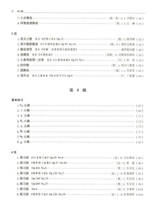 第4级和第5级的曲目编排注重循序渐进,从基础的调式练习到经典作曲家的作品,既有巴赫、亨德尔、车尔尼等古典音乐大师的经典作品,也有中国民歌改编以及近现代作曲家的创作曲目,展现了中西音乐文化的交融与传承。同时,书中曲目注重艺术性和趣味性的结合,帮助学习者在愉悦的学习过程中提升演奏技巧与音乐表现力。