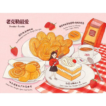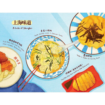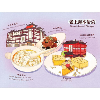 手绘上海自然也各有千秋,是南翔小笼、是“四大金刚”的早餐、是外婆红烧肉,是小绍兴的白斩鸡、是绿波廊的八宝饭,是王宝和的大闸蟹,……是具象的,也是抽象的。