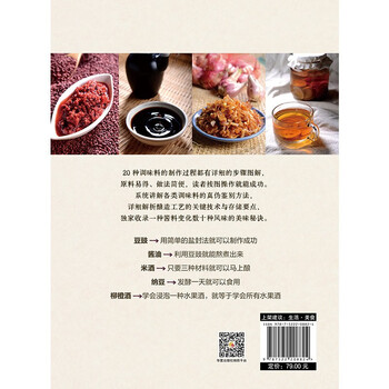 本书是一本生活类图书,介绍了20种最基本的调味料的酿制方法,这些平常使用的酱料,材料与做法其实都很简单,作者回归最传统的酿造方法,不偷工、不加料,教你用自己的双手,加上时间的酝酿,制作各种家用常备调味料,为自己和家人的健康把关。每种调味的制作过程都有详细的步骤图解,让每个人跟着制作都会成功。书中还教你如何辨别各种调味料的真假,并介绍了各种调味料成功的关键与保存放法,更透露出一种酱料变出数十种口味的美味秘诀。