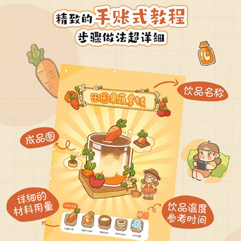 用纯手绘形式介绍DIY饮品的方法,从基本工具、食材灵感到如何确定饮品风味、如何选择基础原料、如何添加口感元素、配色与装饰、给饮品命名等,并介绍56款创意饮品配方,包含来自游戏灵感的特调、植物花朵饮品、以小动物为灵感的饮品、特殊节日饮品等,每款饮品都经过作者亲自实践,食谱以手账形式呈现,配有详细的图文步骤,并介绍设计思路及灵感,还有漫画小剧场,画风可爱,深受网友喜爱。