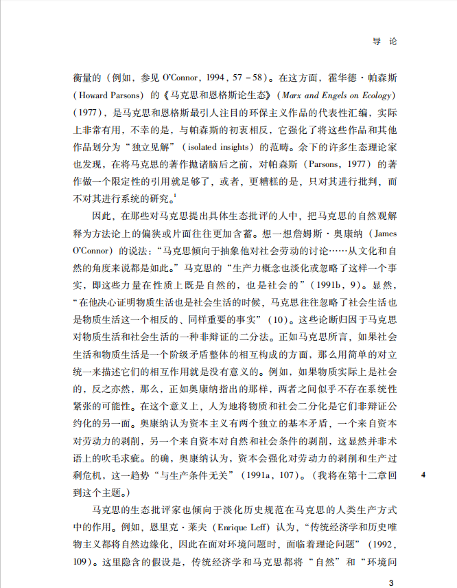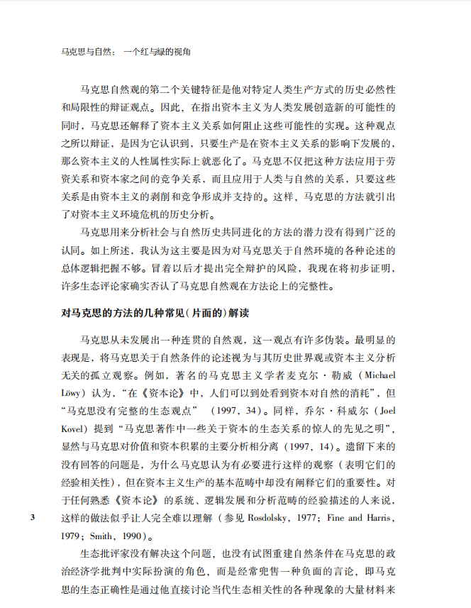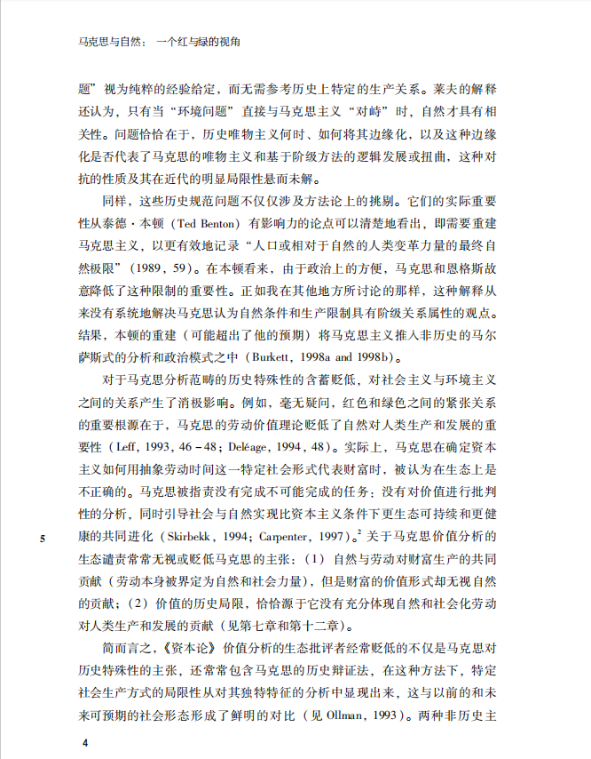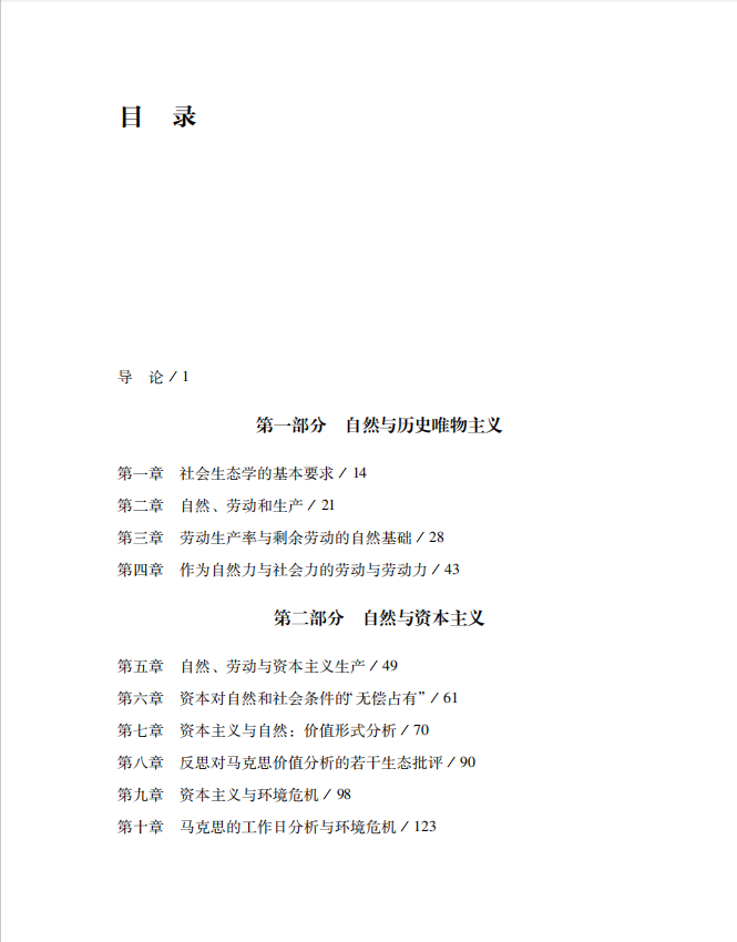 《马克思与自然:一个红与绿的视角》的作者是美国印第安纳州立大学的经济学教授保罗·伯克特,他以马克思生态思想与社会生态学四原则的一致性为理论基础,以“劳动生产”概念为线索,阐释了历史唯物主义理论中自然的基础地位、资本主义与自然的冲突关系以及对马克思共产主义思想是否具有生态内涵研究的具体分析,驳斥了西方马克思主义者提出的马克思陷入“普罗米修斯”的错误观点,试图通过建立共产主义,从根本上解决生态危机。 本书试图回到马克思,并揭示马克思的唯物主义自然观,通过重构马克思的生态观来反驳第一阶段生态马克思主义者批判,以及当时绿色理论过于强调唯心论、理想主义和道德主义的局限性,并且提出社会主义替代资本主义破坏生态的紧迫任务。通过展示马克思的人与自然的物质交换理论与劳动价值论中的生态维度,构建马克思生态观,从根本上解决生态危机和人类发展危机。