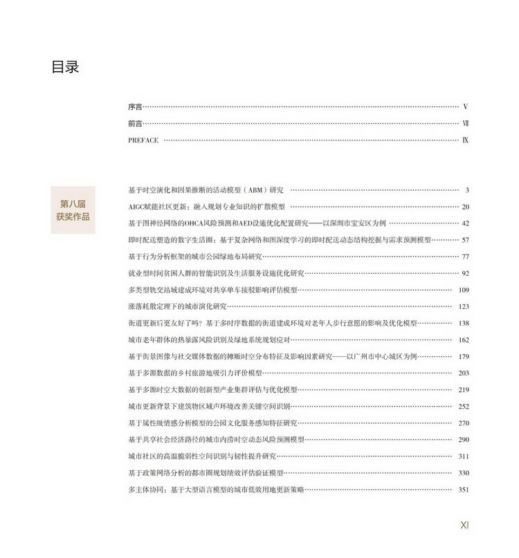 《城垣杯·规划决策支持模型设计大赛获奖作品集2024》(以下简称《作品集》)收录了第八届大赛评选出的19项获奖作品,以飨读者。这些作品涵盖“面向生态文明的国土空间治理”“面向高质量发展的城市治理”两大主题,展示了生活圈优化、城市更新、城市体检、智慧城市设计、都市圈协同发展等领域创新模型的构建技术和决策分析方法,也展示了经典模型理论方法的再创新和人工智能技术的新应用。这些作品展现出规划决策支持模型在解决城市问题、优化资源配置、提高规划效率等方面的重要作用,以及进一步发展规划、运行和治理智能中枢的巨大潜力。