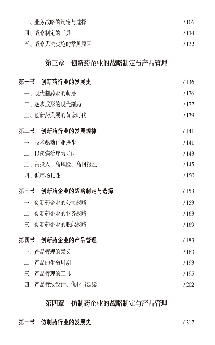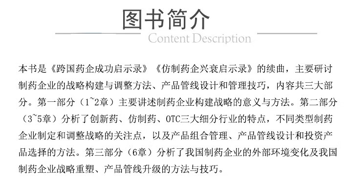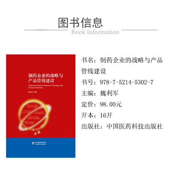 本书主要研讨制药企业的战略构建与调整方法,产品管线设计和管理技巧,内容共计六章,可分为三大部分。第一部分(1-2章)主要讲述制药企业构建战略的意义与方法。第二部分(3-5章)分析了创新药、仿制药、OTC三大细分行业的特点,不同类型制药企业制定和调整战略的关注点,以及产品组合管理、产品管线设计和投资产品选择的方法。第三部分(6章)分析了我国制药企业的外部环境变化,讲述了我国制药企业战略重塑、产品管线升级的方法与技巧。