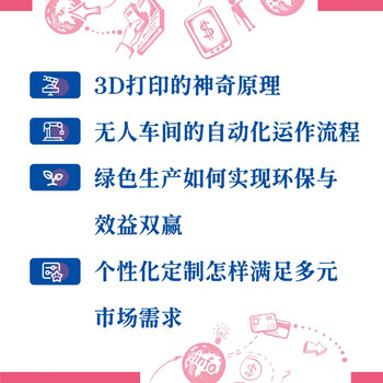 书中从制造行业的“进化史”讲起,带领读者见证传统制造向智能化、数字化的跨越,揭秘机器人如何在工业、医疗、物流等领域大显身手以及数据如何驱动智能工厂实现高效决策与精准生产。通过趣味图解,3D 打印的神奇原理、无人车间的自动化运作流程变得一目了然,绿色生产如何实现环保与效益双赢、个性化定制怎样满足多元市场需求等复杂概念也迎刃而解。
