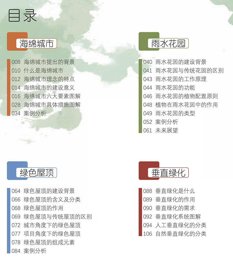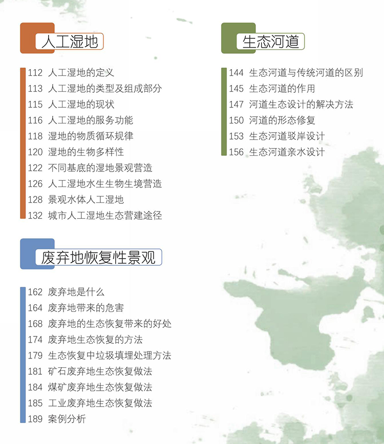 全书紧紧围绕当前景观设计领域热点问题景观生态进行阐述,包括海绵城市、雨水花园、绿色屋顶、垂直绿化、人工湿地、生态河道和废弃地景观七个部分。这七部分基本上涵盖了景观生态的主要问题,是当前景观方向的热点问题,不仅是学术研究的重点课题,也是景观设计实践的主要方向。