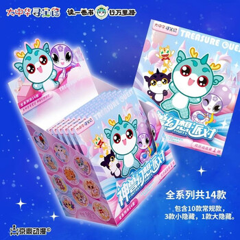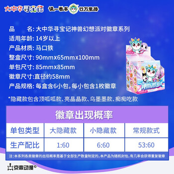 大中华寻宝记神兽幻想派对徽章系列每盒含6小包,每个小包内含1枚徽章,款式随机。全系列共14款,包含10款常规款,3款小隐藏款,1款大隐藏款。