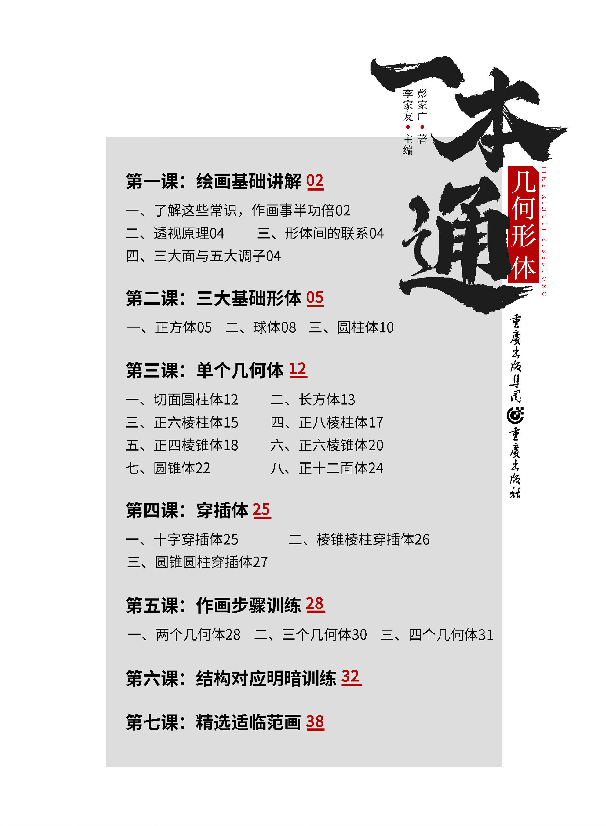本书是一本石膏几何体辅导书,适合广大美术爱好者使用。本书分为六个章节:第一章节为几何形体基础知识;第二章节是方体类几何形体,包括正方体到八棱柱等多个直角类几何形体;第三章节是弧面类几何形体,包括球体以及从圆柱体到圆锥体等多个几何形体;第四章节是棱锥和多面体;第五章节是穿插体;第六章节是组合范画临摹。