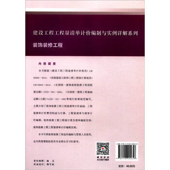 《建设工程工程量清单计价编制与实例详解系列:装饰装修工程》根据《建设工程工程量清单计价规范》GB50500-2013、《房屋建筑与装饰工程工程量计算规范》GB50854-2013、《全国统一建筑装饰装修工程消耗量定额》GYD-901-2002、《全国统一建筑工程基础定额(土建)》GJD-101-1995等现行标准规范编写,主要介绍了装饰装修工程工程量清单计价基础、工程量清单计价费用构成与计算、工程量清单与清单计价编制、装饰装修工程工程量计算及清单编制实例、装饰装修工程工程量清单计价编制实例。