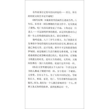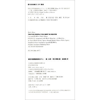 《米奇·阿尔博姆作品:你在天堂里遇见的五个人》就其风格与题材而言,不啻为《相约星期二》的承继与延伸。自问世以来,这部作品连续占据美国各大图书畅销排行榜前五位,迄今已超过四十周。小说讲述的是一位八旬老人爱迪的故事。爱迪是一个海滨游乐场的维修工人,在他八十三岁生日那天,他为了从一部坠落的游乐车下面救出一个小女孩,不幸丧生。当他醒来的时候,他已经来到了天堂。但是,天堂并不是他想象中的伊甸园,不是那个他可以同亲人相会,可以“在云头飘浮,在河中嬉戏,在山间漫游”的地方。他在天堂里遇见了五个人。这五个人中有他失去的亲人、熟人以及完完全全的陌路人。他们逐一地向爱迪讲述和解释了他生活中似乎与他毫不相关的故事和联系,揭示出这样一个道理:所有的生命都是相互关联的,就像河底的卵石,一个牵连一个。爱迪终于领悟到,他在人世间自认为毫无意义的生活,其实正是他生命的价值所在。作者米奇·阿尔博姆以感人肺腑的笔触讲述了一个娓娓动听的故事,而故事中揭示的人生哲理更为耐人寻味。每一位读过《米奇·阿尔博姆作品:你在天堂里遇见的五个人》的人,心灵都会受到震撼。