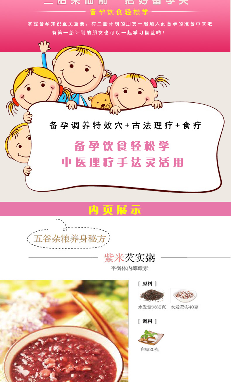 本书以对女性孕育生命重要的子宫、卵巢、内分泌为线索,用通俗易懂、生动平实的文字,详细介绍了孕前身体调养的必要性、有利于受孕的生活环境和作息习惯等内容,并列举了对女性备孕有益的食物,以菜品的形式展现,清楚直接,然后详解了对于女性备孕调养有益的特效穴,以中医的角度对时下影响女性怀孕的常见妇科病症进行了辨证,一一用古法理疗加以防治。书中还配备了高清的菜品图及取穴图、理疗操作图,轻松学做备孕饮食,简单理疗调养。