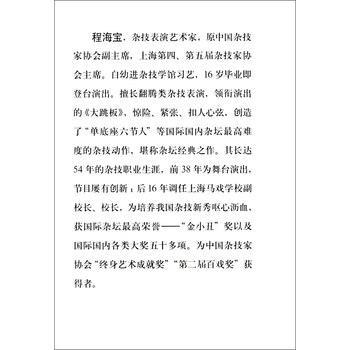 1960年9月5日,这是程海宝终生难忘的一天:他要和哥哥去杂技团报到了。清早,他醒了,一骨碌起身,漱洗完,穿上白衬衫,还是像平时一样,戴上红领巾。可是今天,他不用再去延安中路小学了,他已经是杂技团学馆的一名正式学员了。