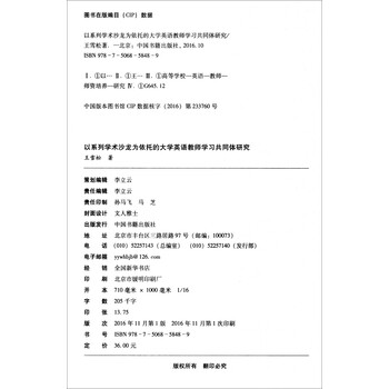 《以系列学术沙龙为依托的大学英语教师学习共同体研究》分为六章:第一章为导言,介绍选题缘起和研究目的;第二章为文献述评,分别对教师专业发展范式、大学英语教师专业发展、教师学习共同体、教师群体文化研究现状做了文献回顾;第三章概括了理论基础和分析框架,着重介绍了《以系列学术沙龙为依托的大学英语教师学习共同体研究》研究的理论基础,即脚手架理论、合作学习理论和团体动力学,并提出分析框架;第四章为研究方法,介绍了本项研究的研究设计、研究场所、研究对象、研究者角色、研究数据的收集与整理、数据分析方法、研究的信效度保证以及伦理问题的处理;第五章讨论了以系列学术沙龙为依托的大学英语教师学习共同体对教师教学研究能力的影响;第六章讨论了以系列学术沙龙为依托的大学英语教师学习共同体对教师群体文化的影响;第七章讨论了本研究的结论,讨论了研究发现、研究启示、研究创新、研究局限及未来研究方向、研究者反思。