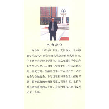 陈学民,1972年11月生,天津市人,北京印刷学院文化产业安全研究院京津冀研究所主任。中央财经大学经济学博士,北京交通大学中国产业安全研究中心应用经济学博士后,中国准精算师。研究方向:金融经济学,产业经济学,产业安全与金融安全。参与国家社科基金重大招标课题、教育部及国家海洋局重大课题多项,主持和参与省部级课题近十项;在国内外核心期刊发表论文十余篇。李孟刚,1967年4月出生,山东省博兴县人。经济学博士,交通运输工程和理论经济学双博士后;北京交通大学教授、博士生导师、国家社科基金重大招标项目首席专家、新华社特约经济分析师。现任中国产业安全研究中心(CSISR)主任、北京市哲学社会科学北京产业安全与发展研究基地(省部级科研平台)负责人、首席专家;大连理工大学北京研究院首席专家;北京印刷学院文化产业安全研究院院长、首席专家;《管理世界》常务编委,兼任中国产业安全论坛秘书长。2009年12月入选教育部新世纪优秀人才支持计划。