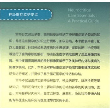 本书为神经重症监护专科的新进人员提供了本专业临床实践中实用且浅显的观点。内容丰富而且文字浅显易懂,对临床医生而言,如果希望尽快掌握重要的临床数据,或进一步拓展对神经重症监护专科的了解,本书不失一本参考书。