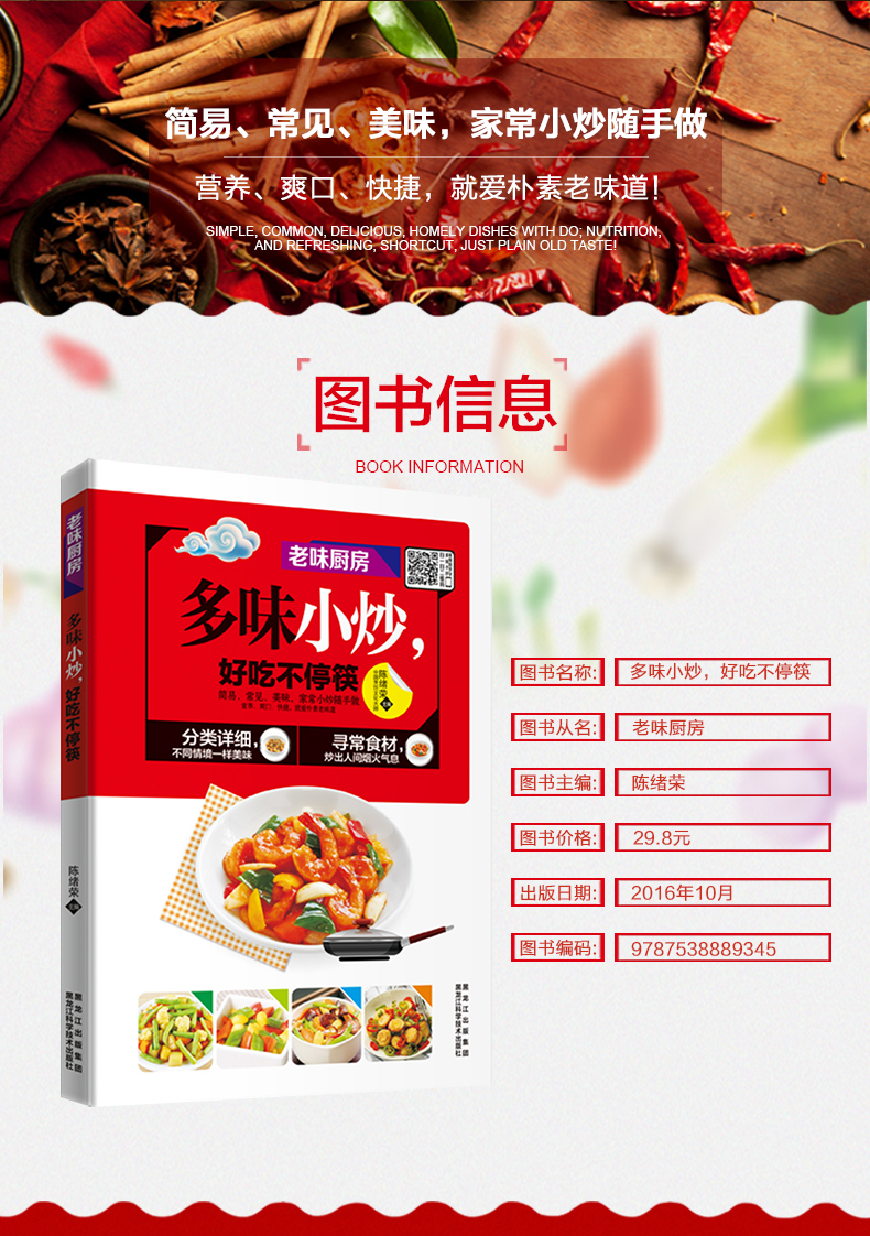 炒是中国饮食文化中很有烟火气的一种烹饪方法,那“刺啦”的一声,是这世间动听的声音之一,从锅里随之而散发的香气,萦绕在厨房中变成了家的气息,令人迷恋。因此,家常小炒深受大众喜欢,方便又美味。此外,许多人喜欢在家炒菜做饭,平时也变化着花样来丰富餐桌的菜式,可是终究敌不过漫长的日子,家里的老三样终究是吃厌了,于是做饭的热情也消退不少。这时需要一本小炒书,带给读者做菜灵感,让读者对着市场上有限的食材做出不一样的菜,重燃烹饪的兴趣和热情!
