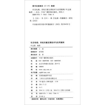 《社交电视:系统关键支撑技术与应用案例》是一本系统介绍社交电视技术架构、关键支撑技术及行业应用案例的专业书籍。英国电视制作和发行公司Shine Limited*席执行官伊丽莎白.默多克在2011*美电视节目高管协会(NATPE)的年会上表示:“社交网络是电视的*后希望!”社交电视作为社交媒体与电视的有机结合,是新兴媒体与传统媒体融合发展的一个典型案例,我国广播电视行业目前也正在对社交电视进行大胆、有益的尝试。《社交电视:系统关键支撑技术与应用案例》将从社交电视概念、当前应用模式的解读入手,分析社交电视的系统架构,关键支撑技术,并以中央电视台“CCTV微视”等社交电视应用为典型案例,分析社交电视在广电行业的应用情况及未来展望。