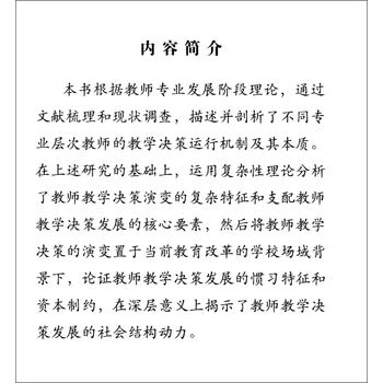 国内关于教师教学决策的比较研究包括心理学视角下对新手和专家教师教学行为的比较、教育学视角下对不同专业发展阶段教师的教学过程、教学行为的比较,这些研究可分为三部分。第一部分是从教师的教学行为人手分析,分析比较新手一专家型教师的教学决策认知过程及其特性;第二部分是从教学过程中涉及的教师言语行为表现、教学策略运用、学生评价等方面进行的比较;第三部分是直接围绕教师教学决策进行的比较研究。这些研究成果都为《教师教学决策的运行机制研究》提供了有价值的借鉴。