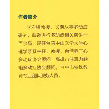 《多动儿的故事》从父母的观点出发,与众多家长分享身为多动症儿童的父母的苦与喜。全书共有十篇故事,第一篇引领的故事介绍多动症儿童在课堂上及在家里的行为症状,让父母了解多动症儿童的行为特征;接着以父母观点逐一带出多动症儿童的父母如何成为高效能的父母;之后列举两位多动症初中生的故事,让父母体会需陪伴孩子的路有多长,及不同阶段的多动症孩子需关注的点会有所不同;最后是一位读硕士的多动症学生的故事,让父母了解多动症儿童仍大有可为,不要放弃努力。