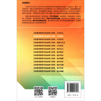 这套丛书是北京市教育委员会委托项目“首都义务教育阶段学生学业标准的研究”的重要研究成果。此项研究的重要理念之一,是始终强调义务教育阶段学科学生学业标准是在新课程理念的指导下,对课程标准内涵的不断丰富;强调研制学业标准的目的在于改善和提高教师日常教学设计与评价水平,充分发挥评价对教学的诊断和反馈功能。丛书的结构清晰,采用“理论框架设计学业标准评价示例教学设计示例”的结构,为义务教育阶段教师提供学业标准解读评价示例与教学设计示例,为教师在教学实践中正确理解与运用标准提供支持与服务。内容呈现架构也从项目研究早期研制的由内容和能力两个维度构成的基础理论框架,扩展到内容、能力、情感态度价值观三个维度的建构,并力图在内容标准中渗透情感态度价值观的具体要求。在此基础上,又将部分原有仅适用于描述合格水平的内容标准条目,进一步拓展、区分、细化为包括合格、良好、3个学业水平的内容标准条目。该套丛书强调基于学业标准学科教学与评价示例等的实践操作研究,每个学科都提供了学业标准的评价示例和教学设计示例,供教师在日常教育教学实践中落实学业标准参考。