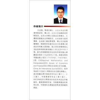 王治国,管理学博士。北京大学光华管理学院讲师、博士后,北京大学战略研究所研究员,北京大学博士后联谊会理事长。主要研究领域为应用博弈论、公共财政与政府债券、公共部门绩效管理等。博士论文获得教育部、国务院学位委员会2012年度博士研究生学术新人奖资助。现主持在研教育部人文社会科学研究青年基金(16YJCZH110)1项,参与在研教育哲学社会科学研究重大课题攻关项目(13JZD015)1项,国家自然科学基金面上项目(71173167、71473190)2项。已在Applied Mathematics and Computation(SCI)、Annals of Economics and Finance(SSCI)等杂志发表论文10余篇。China:An International JournaI(SSCI)、经济学动态(CSSCI)等国内外杂志匿名审稿人,多次受邀出席中国经济学年会(第十二、十三届)、中国管理学年会(第十届)、INFORMS 2012等国内外知名学术会议并做报告。曾获国家奖学金、中国青年志愿服务奖等多项荣誉和奖励。