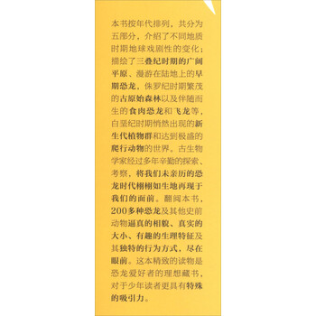 在每章“焦点”这一节里,更为详尽地描述了典型生物或生物群体的特征,例如翼龙、剑龙、霸王龙等等,科学地探查了那些迷人的史前动物的生活方式。