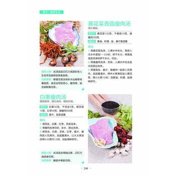 《每天一碗养生汤》容纳养生百味精华,精选738款共12类滋补功效的美味靓汤。全书靓汤品种齐全,分类详尽,方便您居家煲汤时速查速用。不仅涵盖使用各种烹调技法煲出的美味汤羹,更包含各具滋补功效的药膳汤,以及满足四季不同调理补身需求的应季好汤。