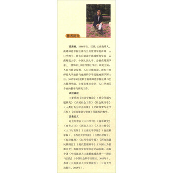 梁海艳,1986年生,汉族,云南曲靖人,曲靖师范学院法律与公共管理学院讲师,人口学博士。曾先后就读于曲靖师范学院、云南师范大学、中国人民大学,分别获得理学学士、理学硕士和法学博士学位。研究方向:人口与社会发展、人口迁移流动。现在云南师范大学旅游与地理科学学院做地理学博士后。2015年8月就职于曲靖师范学院法律与公共管理学院,主要从事社会学、人口学相关专业的教学与研究工作。