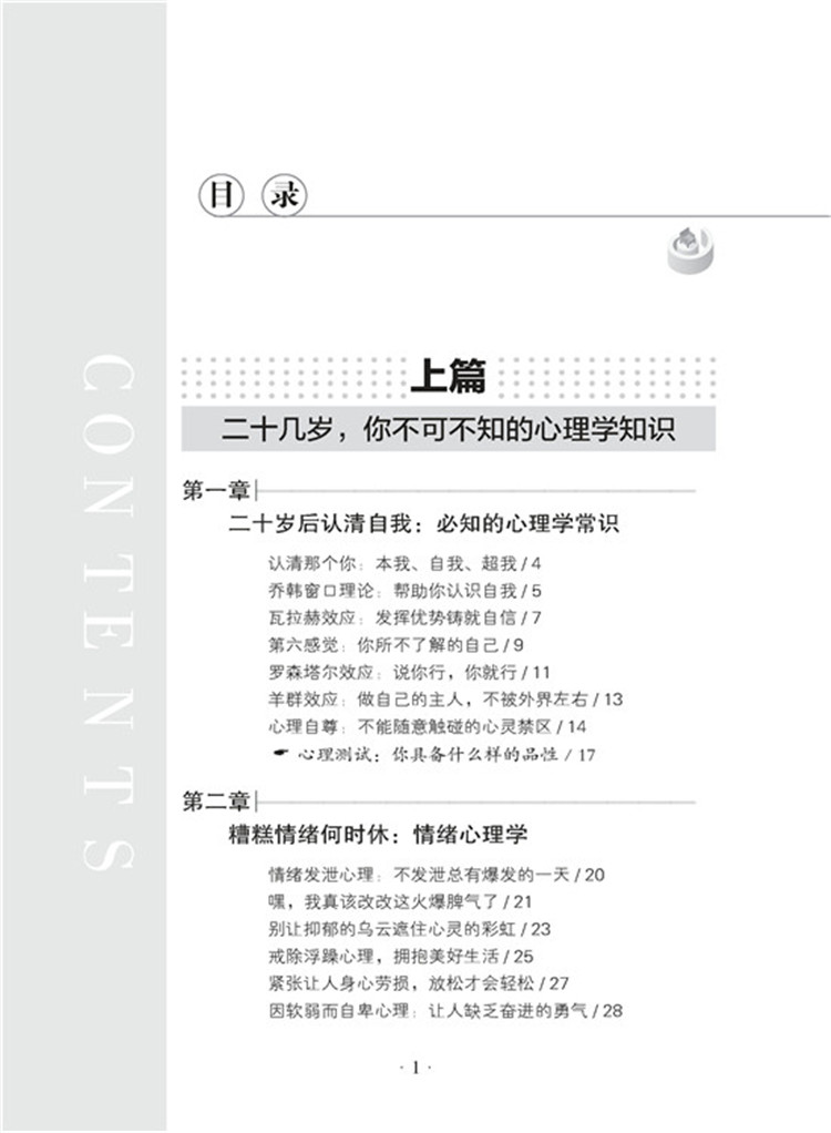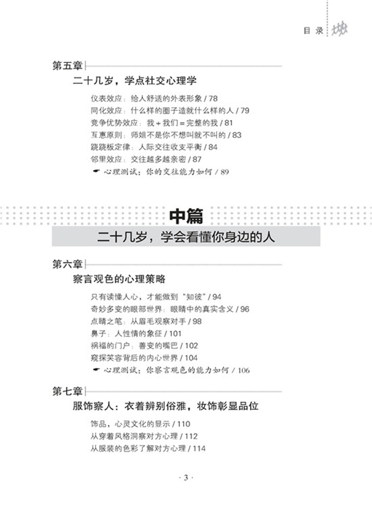 2.本文的正文内容为二十多岁的读者量身打造,板块丰富。通过【“心道”秘闻】让读者对照自身情况了解心理轨迹,然后【用“心”说“理”】掌握心理知识并进行运用。