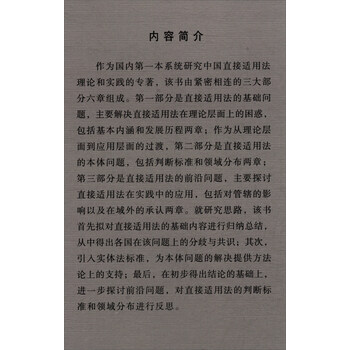 作为国内一本系统研究中国直接适用法理论和实践的专著,《国际经贸领域的直接适用法研究》由紧密相连的三大部分六章组成。第一部分是直接适用法的基础问题,主要解决直接适用法在理论层面上的困惑,包括基本内涵和发展历程两章;作为从理论层面到应用层面的过渡,第二部分是直接适用法的本体问题,包括判断标准和领域分布两章;第三部分是直接适用法的前沿问题,主要探讨直接适用法在实践中的应用,包括对管辖的影响以及在域外的承认两章。就研究思路,《国际经贸领域的直接适用法研究》首先拟对直接适用法的基础内容进行归纳总结,从中得出各国在该问题上的分歧与共识;其次,引入实体法标准,为本体问题的解决提供方法论上的支持;最后,在初步得出结论的基础上,进一步探讨前沿问题,对直接适用法的判断标准和领域分布进行反思。