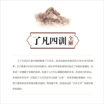 中国古人最推崇的人生境界,就是要达到“三不朽”,即立功、立德、立言。认为只有在这三方面都取得了一定的成就,才能说是成功的人生;而只有圣人才能将这三件事都做得完满,这样的圣人从古至今屈指可数。立功,就是建立功勋,即在治国治民之上有功绩;立德,就是树立德行,即在修身养德上达到一定境界;立言,就是著书立说,树立经典可传的言论。圣人,自然就是像孔子、释迦牟尼那样的人物,他们留下的言论、关于他们事迹的记述虽然很多,但毕竟年代久远,而且普通人又没有他们那样的资质,那该如何追求不朽的成功人生呢?恰好,了凡先生就是一个“成功人士”,他所作的这本《了凡四训》就是在向自己的儿子传授自己如何走向成功的,如何从一个童年丧父的孩子、一个本会默默无闻的小吏,成长为一代名臣、思想家的。