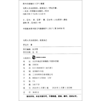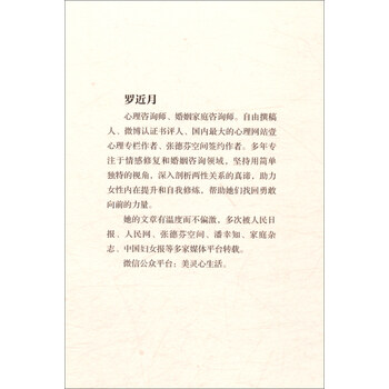 对于爱情,作者曾经以为,只要自己足够完美,一定会有人来爱,也一定不会被辜负,可是作者经历过的和看见过的故事告诉她,事实并非这样。《当男人无法改变时,改变自己》里的内容,更多的是两性关系中的一种映射,期待它能引发大家从另一个角度去思考自己,从不想要的生活中,看见想要的未来。