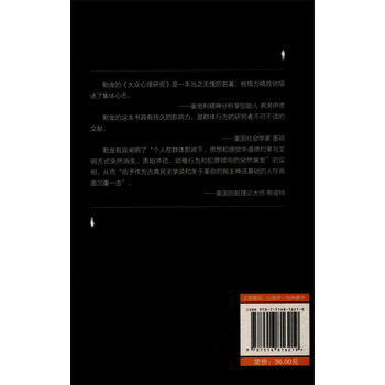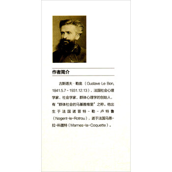 古斯塔夫·勒庞(Gustive Le Bon,1841~1931),法国著名社会心理学家和社会学家,以研究群体心理特征而著称。1866年,他在巴黎获得医学博士学位。1884年开始研究群众心理学。他的研究涉及三个领域:人类学、自然科学和社会心理学。晚年,他的兴趣转向社会心理学。他认为,民族精神或种族灵魂是整个社会生活的基础。勒虎著名的著作《乌合之众:大众心理研究》(The Crowd:A Study of the Popular Mind)出版于1895年,已被翻译为近20种语言。19世纪20年代,他的思想达到了高峰、他的预知令人震惊,他在作品中预见了20世纪所有的心理学和政治发展。此外,他还写有《各民族进化的心理学规律》《法国大革命和革命心理学》《战争心理学》等一系列具有广泛世界影响的社会心理学力作。
