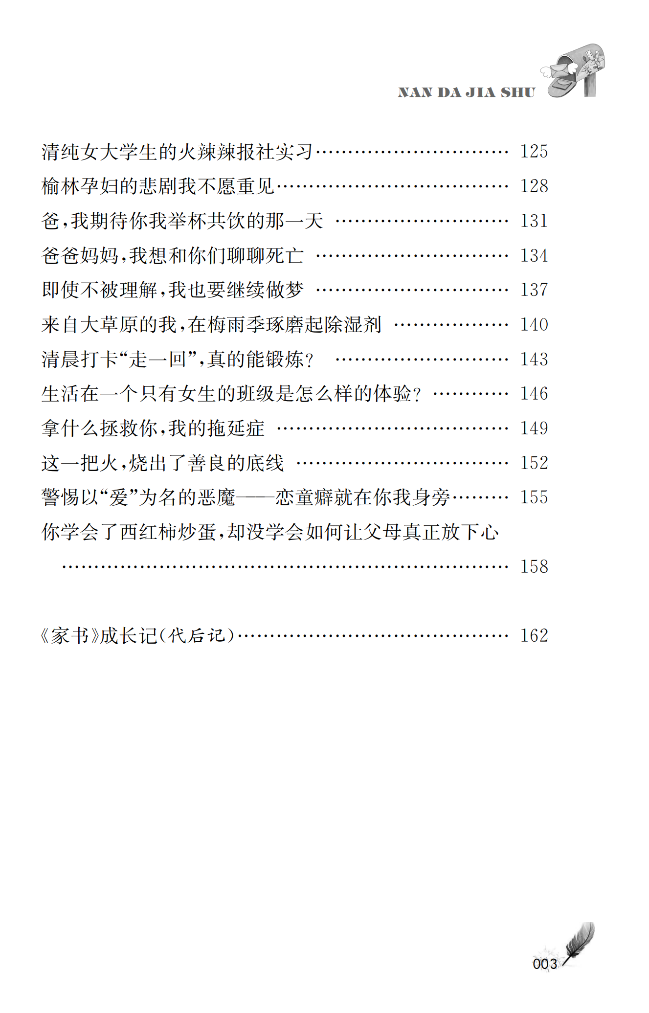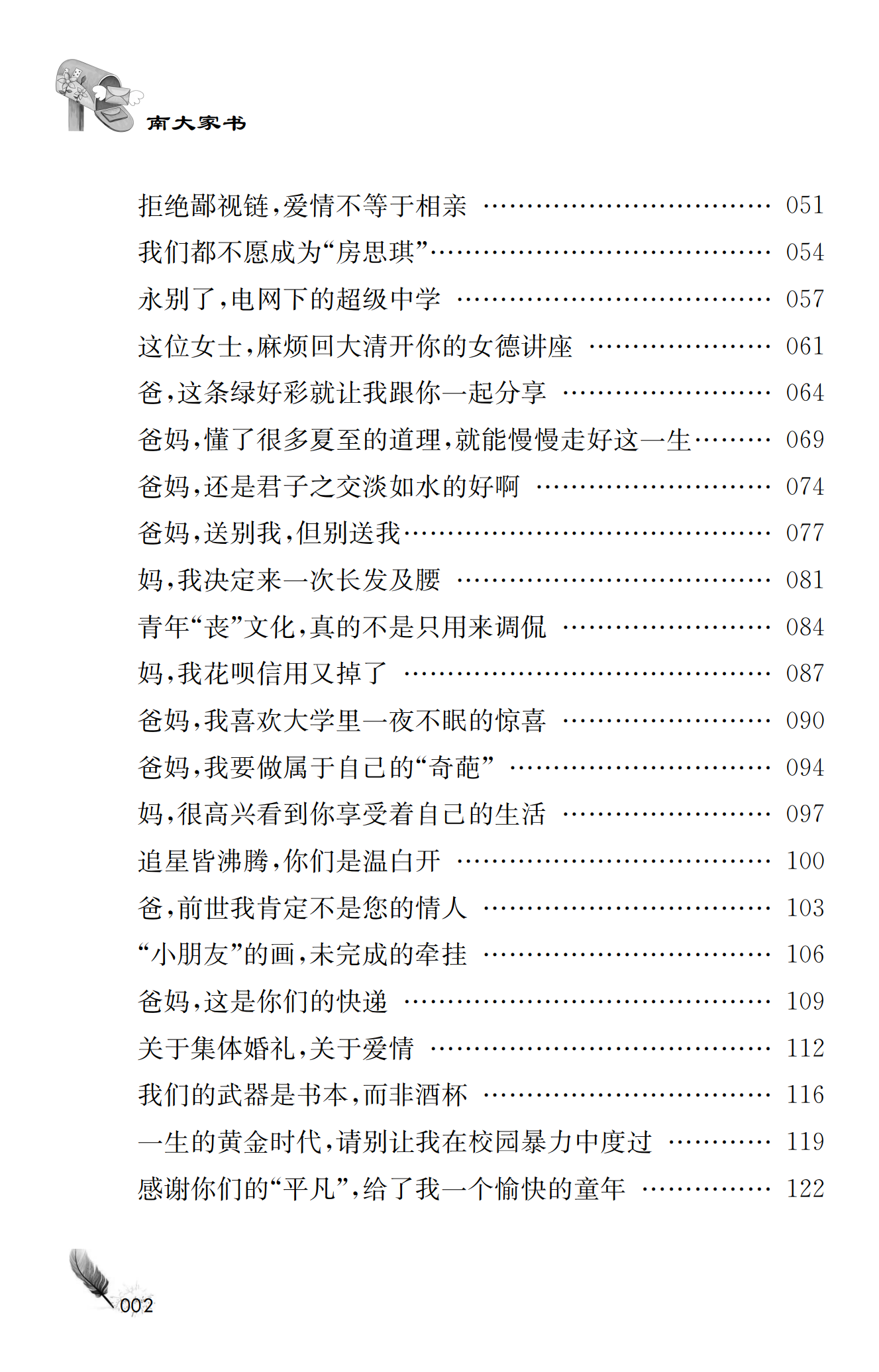 孩子离家步入大学,对很多家庭来说是一件大事。父母关心、忧心、操心、担心?孩子总有那么几句话,想说而又说不出。本书一共收录了50篇南京大学《家书》栏目的优秀作品,每一篇都经过了精心的打磨。我们将自己*想说而又不能说的话,都写在书信中,录成音频,让心声得以被保存,本书希望通过这或温暖,或悲伤,或有趣,或平淡的书信,倾诉孩子的真心,能够让父母了解我们的大学生活,满足父母们的关怀之心。