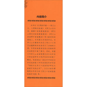 《文明的印痕:贺兰山高伏沟至贺兰口岩画》在《文明的印痕——贺兰山大、小西峰沟岩画》《贺兰山白头沟、插旗口岩画普查报告》《贺兰山高伏沟岩画普查报告》《贺兰山岩画野外普查概述》等文献资料的基础上,采用图文并茂的形式,对贺兰山东麓高伏沟至小贺兰口之间百余幅精美的岩画进行了详细的介绍,并将岩画普查信息以表格的形式在附录中做了展示。同时,将银川市贺兰山岩画管理处多年来所进行的岩画研究与保护性的实验做了概述,包括2012-2013年申请成功并完成的银川市科技局软科学项目“3D技术在贺兰口岩画保护研究与旅游开发的应用”,以及与南京博物院合作进行的《贺兰口岩画抢救性保护方案》等。