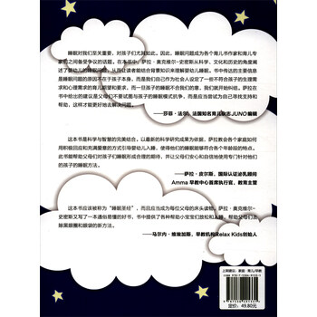 ★这本书是科学与智慧的完美结合。以新的科学研究成果为依据,萨拉教会各个家庭如何用积极回应和充满爱意的方式引导婴幼儿入睡,使得他们的睡眠能够符合各个年龄段的特点。此书能帮助父母们对孩子们睡眠形成合理的期待,并让父母们安心和自信地使用专门针对他们的孩子的睡眠方法。