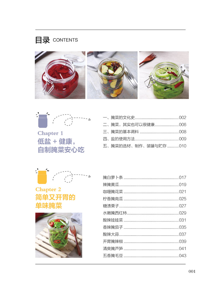 本书就是一本介绍低盐+ 健康的时尚腌菜,它们的制作方法都非常简单,不管您有没有烹饪经验,只需打开本书,准备好对应的材料、调料、容器,就能跟着制作过程轻松制作了,本书精心挑选了35 道美味腌菜供大家学习制作。做好一罐腌菜只需要花上十几分钟,这样在一段时间内都可以随时品尝到用这些食材制成的风味小菜,如沙拉、小炒、三明治等。另外,还推荐了15 道用腌菜制作的精美料理,希望能抛砖引玉,为您开启美味健康的腌渍时光!